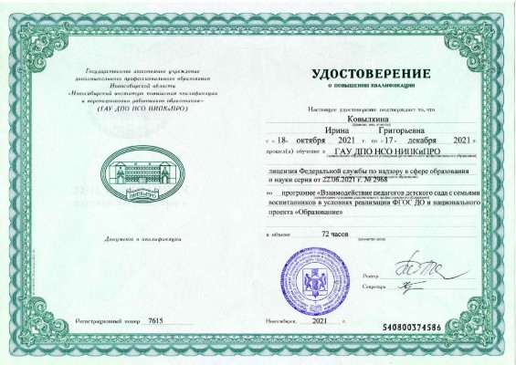 18 октября 2021 - 17 декабря 2021. ГАУ ДПО НСО Новосибирский институт повышения квалификации и переподготовки работников образования. Тема: Взаимодействие педагогов детского сада с семьями воспитанников в условиях реализации ФГОС ДО и национального проекта "Образование" |