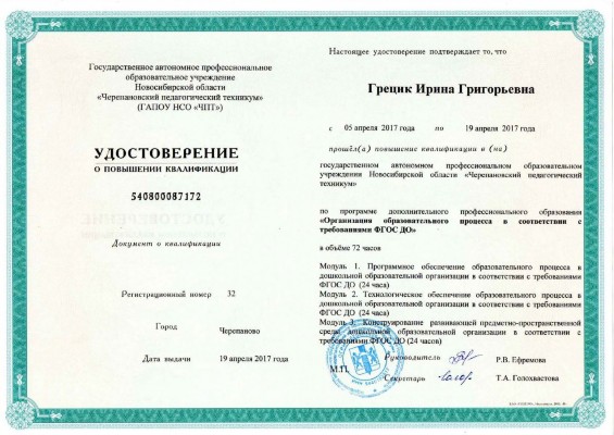 05 апреля 2017 - 19 апреля 2017. Черепановский педагогический техникум. Тема: "Организация образовательного процесса в соответствии с требованиями ФГОС ДО" |