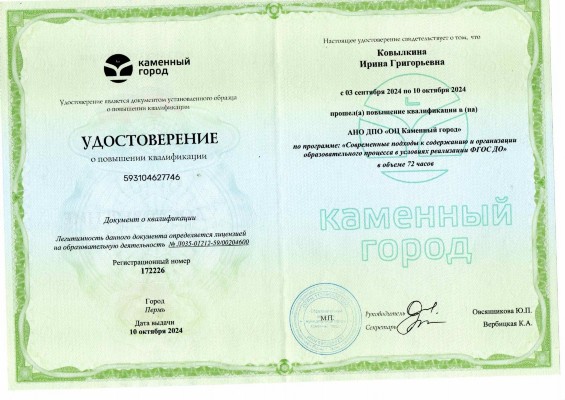 03 сентября 2024 - 10 октября 2024. АНО ДПО "ОЦ Каменный город". Тема: "Современные подходы к содержанию и организации образовательного процесса в условиях реализации ФГОС ДО" МЕСТО РАБОТЫ: МКДОУ детский сад "Теремок" комбинированного вида ЗАНИМАЕМАЯ ДОЛЖНОСТЬ: воспитатель