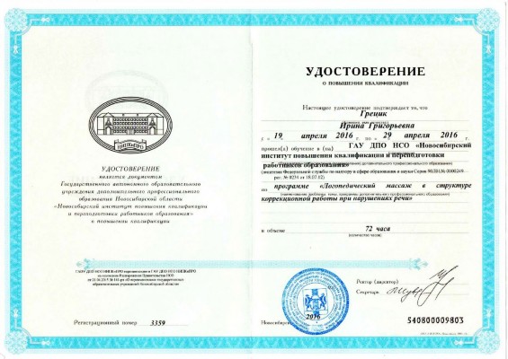 19 апреля 2016 - 29 апреля 2016. ГАУ ДПО НСО Новосибирский институт повышения квалификации и переподготовки работников образования. Тема: "Логопедический массаж в структуре коррекционной работы при нарушениях речи" |