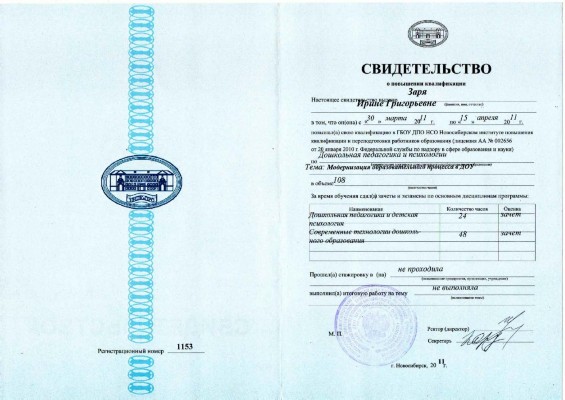 30 марта 2011 - 15 апреля 2011. ГАУ ДПО НСО Новосибирский институт повышения квалификации и переподготовки работников образования. Тема: "Модернизация образовательного процесса в ДОУ" |